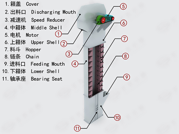 斗式提升機是利用均勻固接于無端牽引構件上的一系列料斗,豎向提升物料的連續(xù)輸送機械。分為環(huán)鏈、板鏈和皮帶三種。