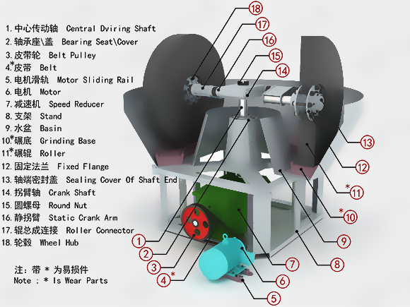 濕碾機采用輪動式磨礦的工作方式:首先電動機將動力傳動至減速機,在減速機帶動下,通過大立軸將力矩傳遞給上方的橫軸,然后經(jīng)安裝在橫軸兩端的拉桿傳遞至碾輪,使碾輪產(chǎn)生驅動力,沿橫軸水平方向做逆時針旋轉運動;工作時的碾輪既能圍繞濕碾機大立軸公轉,又能圍繞碾輪中心軸進行自轉,碾盤則固定不動。添加的礦石物料,在碾磨機內受到來自碾輪自身重量帶來的擠壓力,碾輪公轉自轉時與碾盤產(chǎn)生的巨大摩擦力,在受到反復的擠壓、揉搓、研磨后,被徹底粉碎。