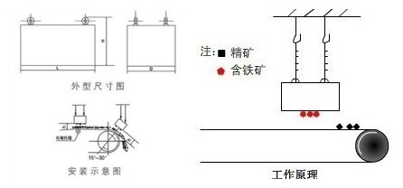 除鐵器主要有兩種形式,一是懸掛式除鐵器、二是磁力滾筒除鐵器。當(dāng)鐵物量少時(shí),采用一般式,而當(dāng)鐵物量多時(shí),采用帶式。一般式的除鐵器通過斷電磁鐵的電流排出鐵物,而帶式除鐵器通過膠帶裝置排除鐵物。