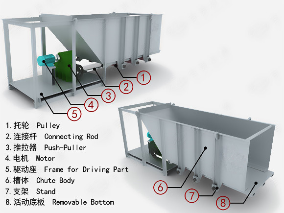 槽式給料機主要由電動機、減速機、聯軸器、偏心機構、漏板、槽架、滾輪等幾個主要部件組成。其結構的共同點是均裝有可控制料層高度的調節閘板;在輸料槽下部為一前后移動的給料板。其不同點是給料板角度不一樣,一般為沿卸料方向向下傾斜5度,以及更大的傾角(小于物料的靜堆積角)和角度為零的水平型等。給料板的動作有前后往復移動式,抖動式以及擺動式等,傳動機構均為曲柄回轉式。