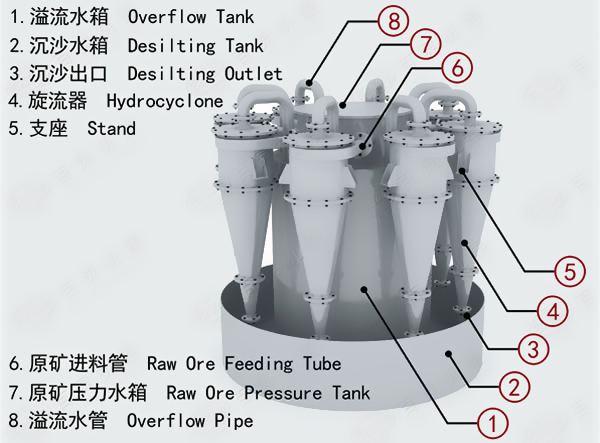水力旋流器下部是圓錐形殼體,上部連接圓柱形殼體。圓柱形殼體上口封死,中間有一層底板,底板中央插入一短管溢流管,在底板下部沿圓柱形殼面的切線方向連接有給礦管口,在底板之上沿殼體切線方向連接有溢流排出管口,錐體最下端有可更換的沉砂排出嘴。水力旋流器多用耐磨鑄鐵制造,為減低殼體內(nèi)壁的磨損速度,還常用輝綠巖鑄石、耐磨橡膠等耐磨材料作襯里。